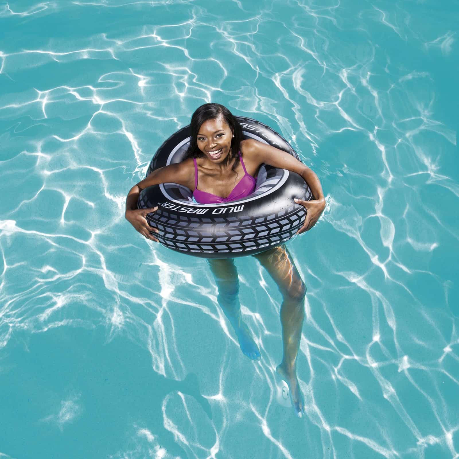 Com um design de impressão de pneu moderno, esta boia é uma maneira divertida de relaxar junto à piscina.