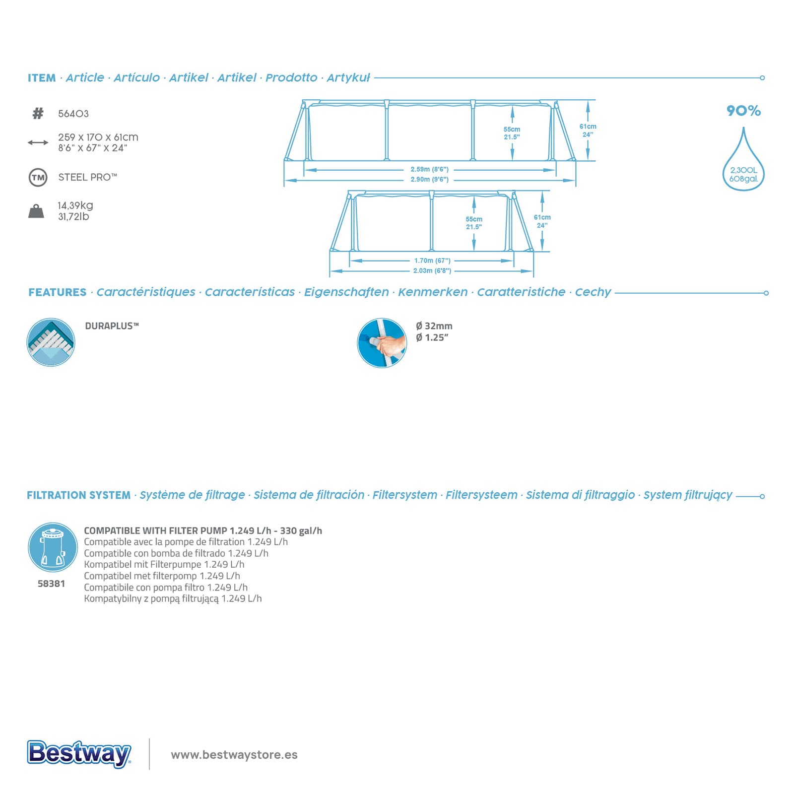 NomePiscina Desmontável Bestway® Steel Pro™ de 2,59 m x 1,70 m x 61 cmConjunto de Piscina Desmontável Retangular Bestway® Power Steel ™ de 2,87 m x 2,01 m x 1,00 mConjunto de Piscina Redonda Desmontável Splash-in-Shade Steel Pro™ UV Careful™ Bestway®
