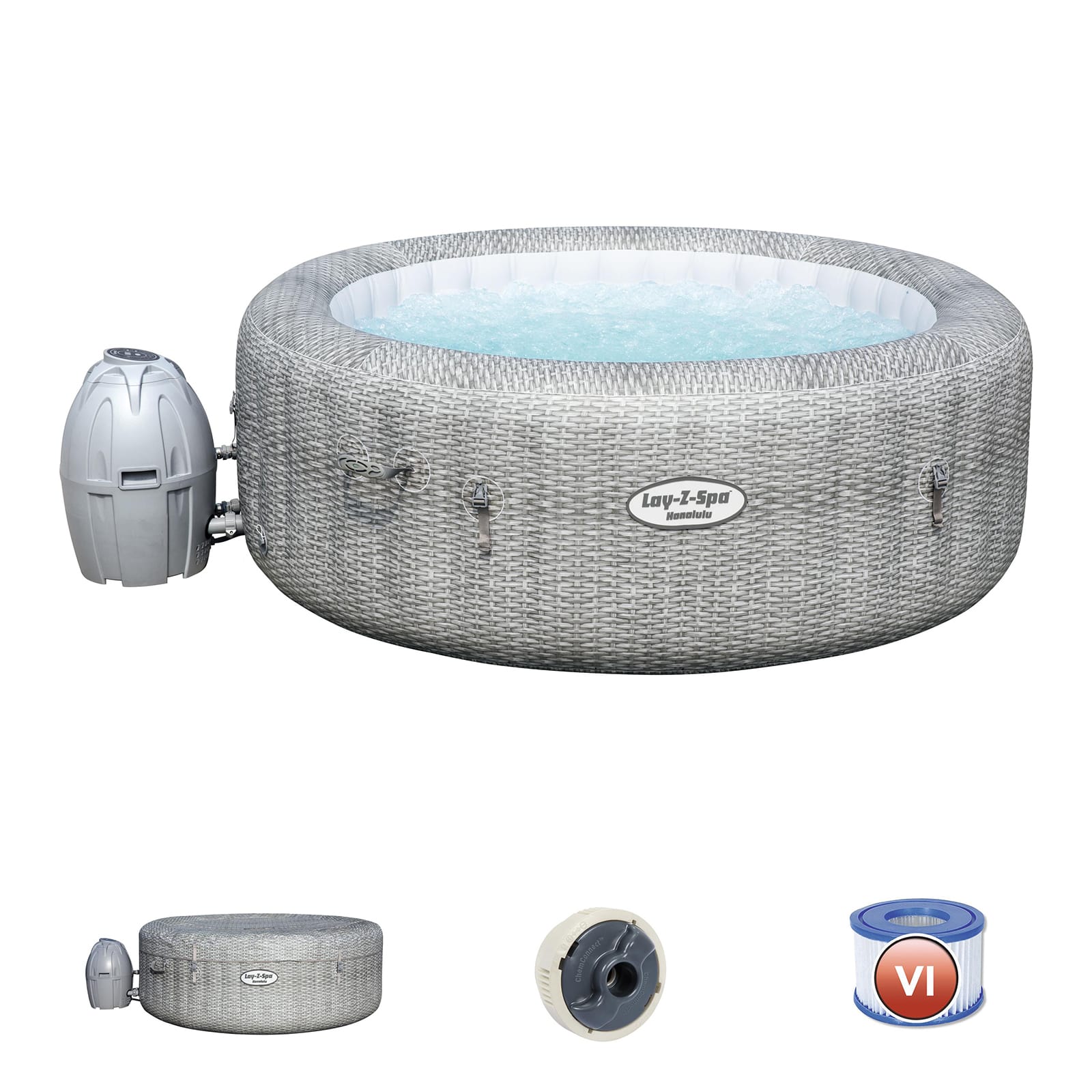 Equipado com uma bomba que o enche rapidamente, aquece, liga a filtragem e controla o sistema de massagem, este spa é simples e prático. Pode aceder facilmente à bomba desde o interior do spa. Inclui porta-copos para bebidas e aperitivos e um dispensador ChemConnect™ que mantém a água limpa e saudável, distribuindo uniformemente a quantidade adequada de cloro. Além disso, o spa Honolulu é fornecido com uma cobertura reforçada que mantém o calor quando não está a ser utilizado e evita que as poeiras e os resíduos se acumulem na água.