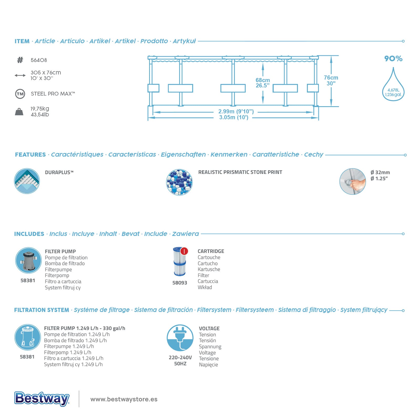 Conjunto de Piscina Desmontável Bestway® Steel Pro MAX™ de 3,05 m x 76 cm