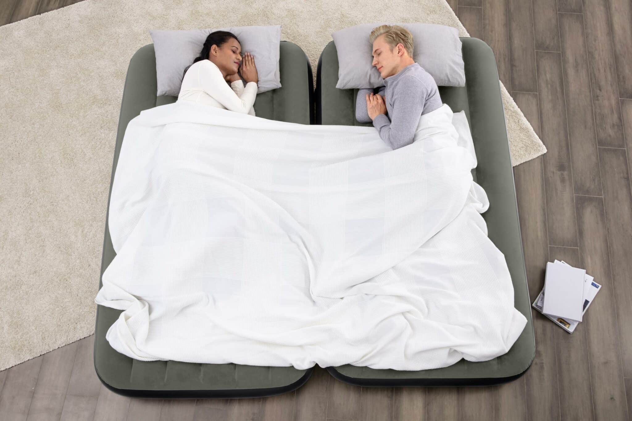 O colchão insuflável 3 em 1 pode ser utilizado como 2 colchões individuais, 1 colchão king ou um colchão de duas camadas com fivelas ajustáveis.