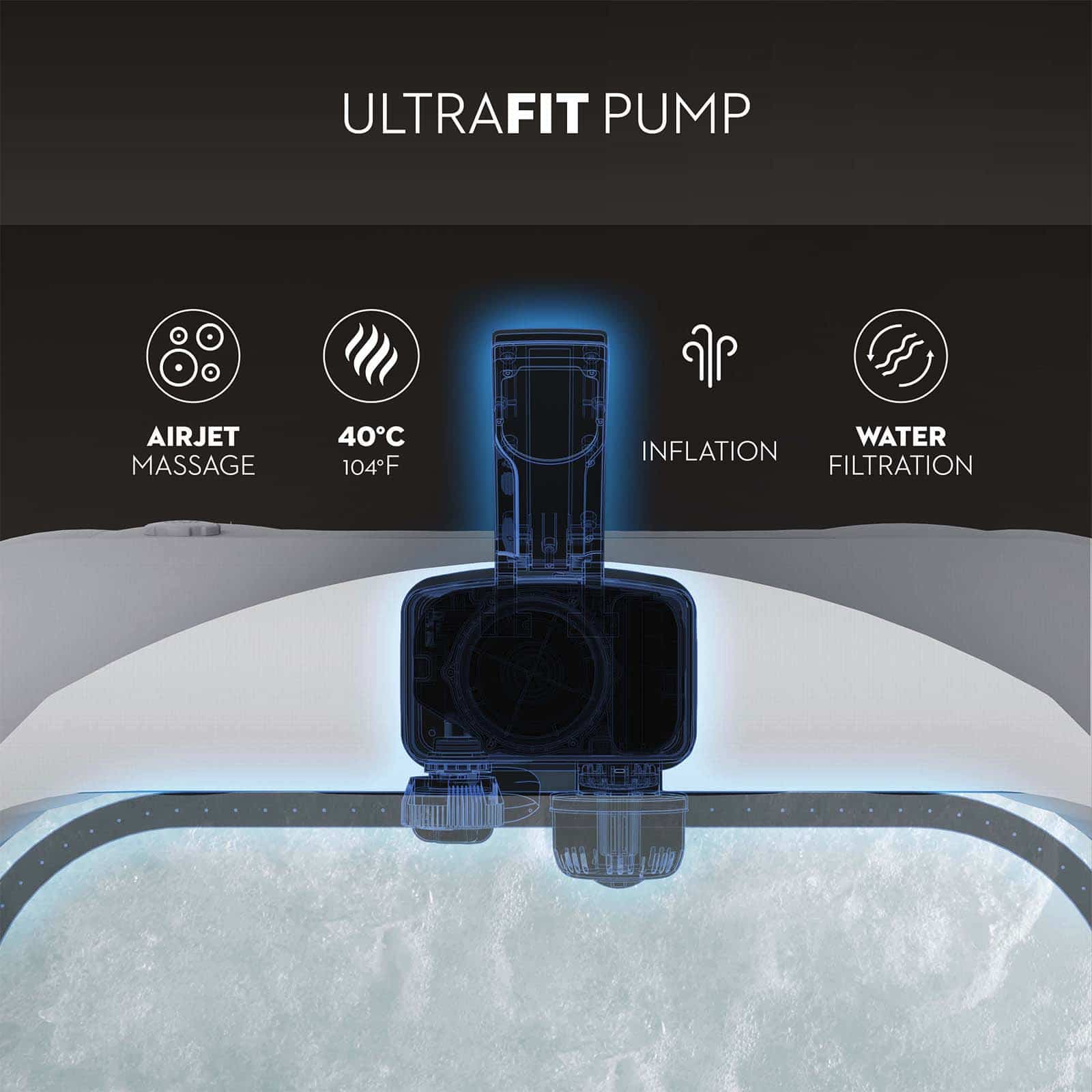 Inclui bomba multifunções UltraFit™ para insuflação, aquecimento e filtração, dispensador ChemConnect® para manter o equilíbrio da água e cobertura reforçada para conservar o calor e manter a água limpa.